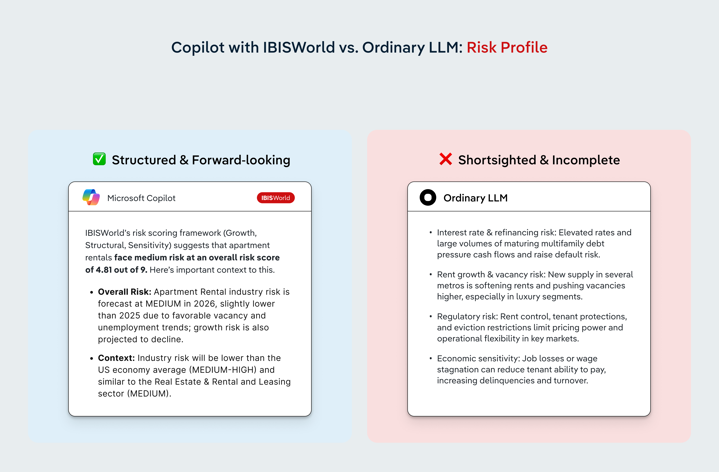 This standardization is critical for professional analysis. By anchoring risk to a defined scoring system, Copilot minimizes the risk of hallucinated severity or inconsistent categorizations that LLMs can produce when reasoning from general knowledge. The framework also provides context. Industry risk is forecast to remain medium in 2026, lower than the US economy average and broadly in line with the broader real estate and rental and leasing sector. The Microsoft Copilot integration can also go further in analyzing structural risk, showing how sensitivity is tied explicitly to measurable drivers such as vacancy rates, unemployment, Treasury yields and urban population trends.