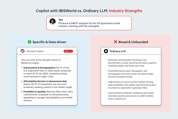 Because Microsoft Copilot reasons directly from IBISWorld’s structured content, it can also incorporate forecast data, demographic trends and risk drivers, making the analysis decision-ready rather than merely descriptive.